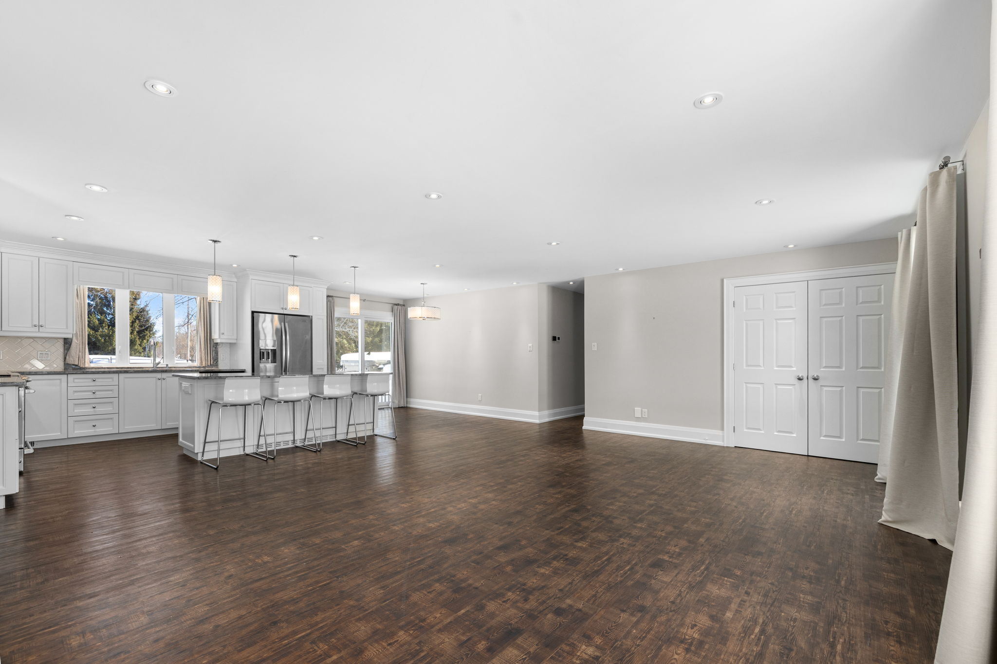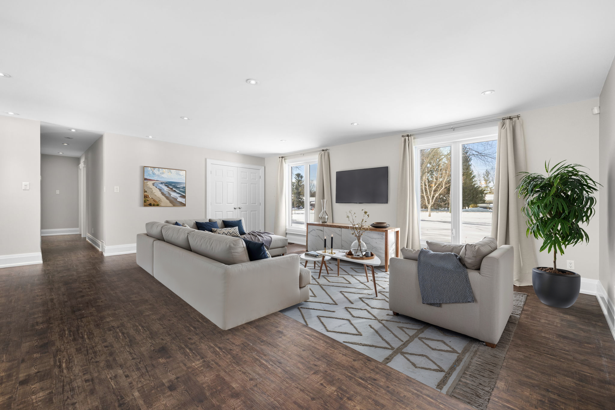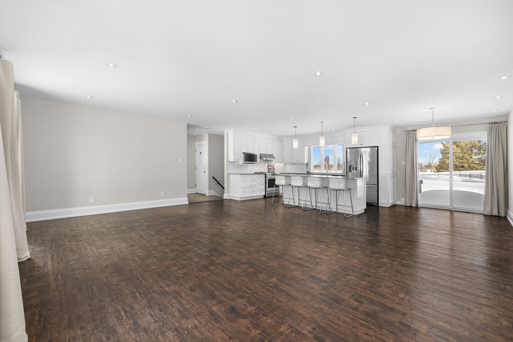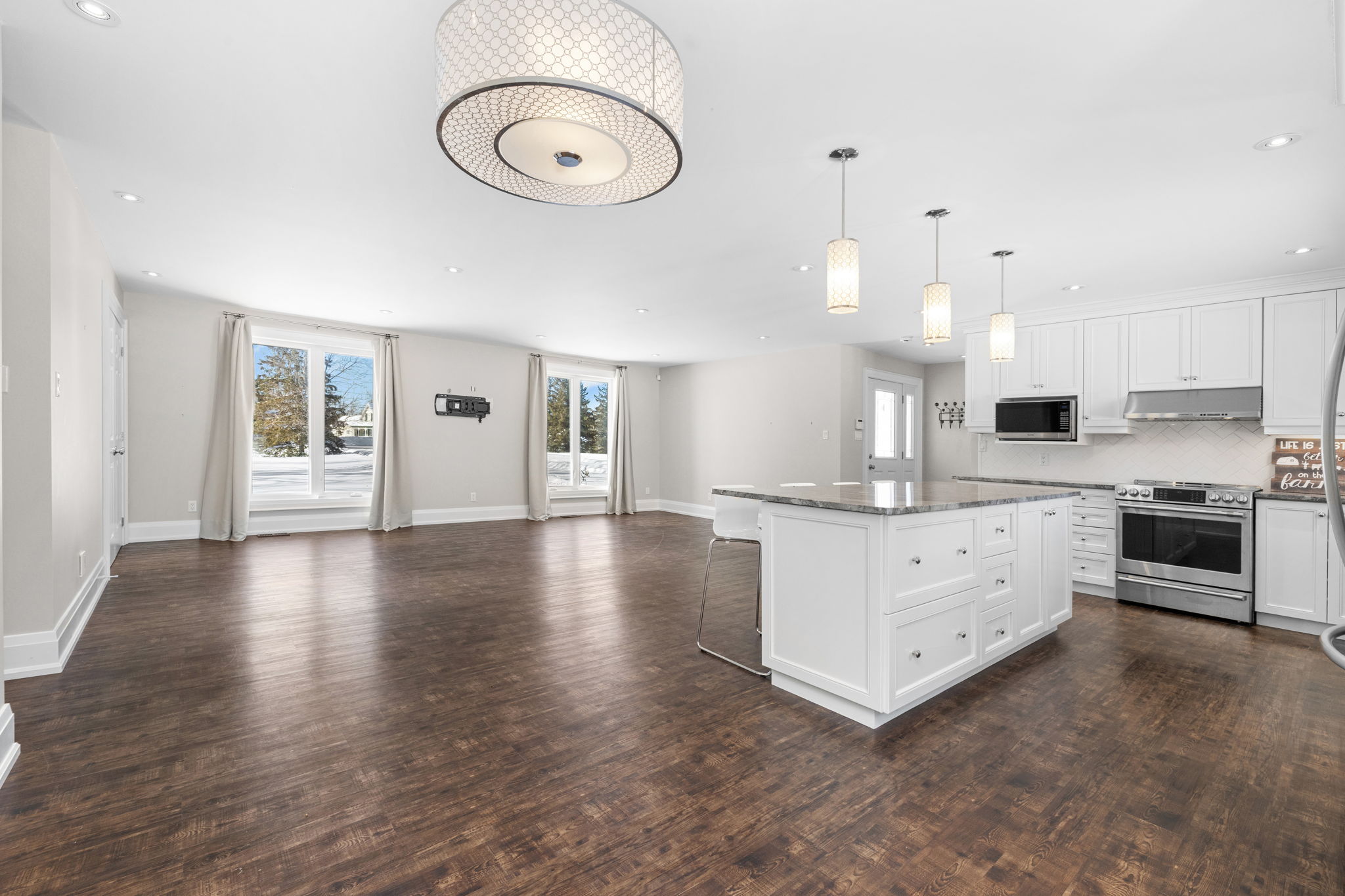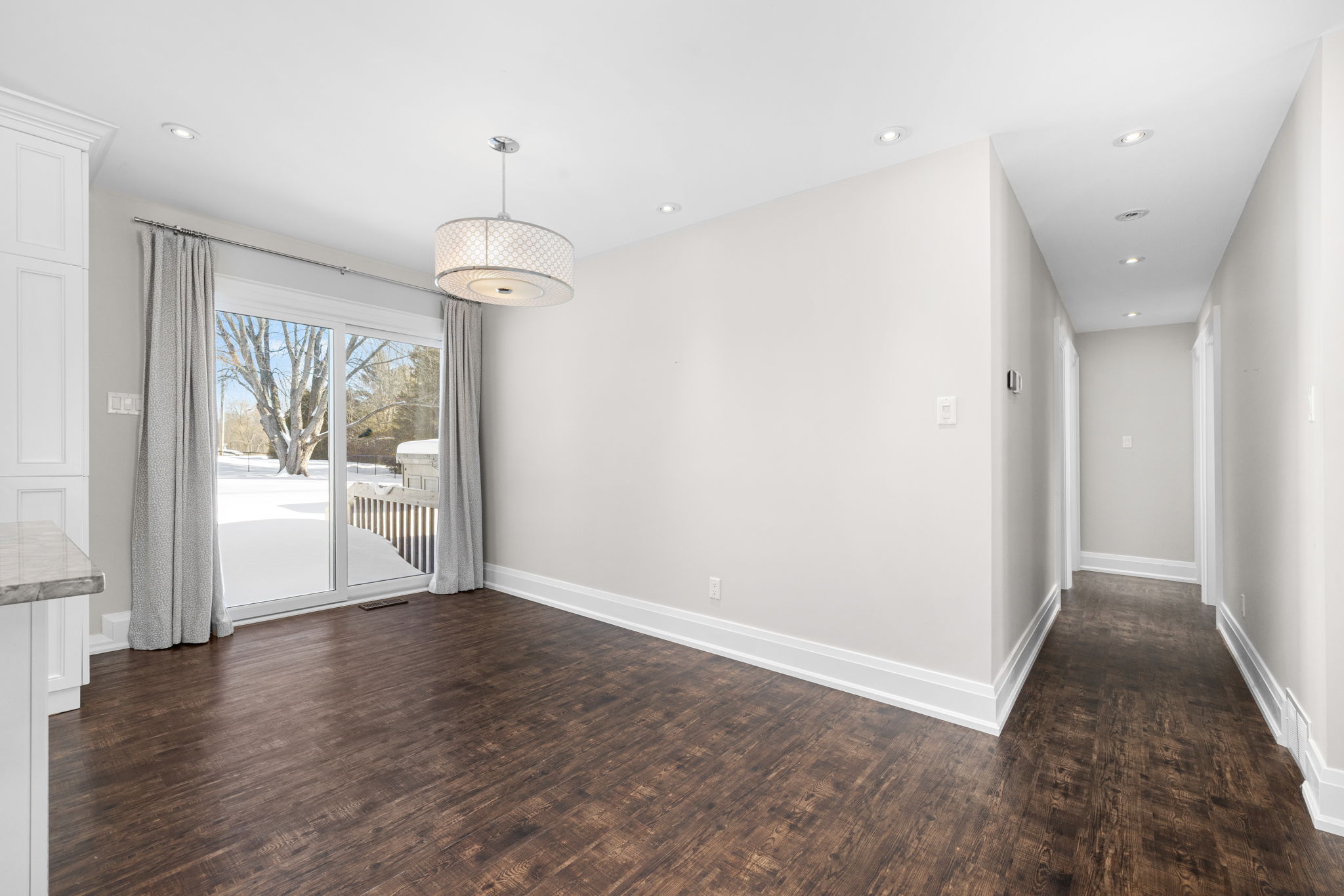 Welcome to this beautifully updated 3-bedroom bungalow offering exceptional space, comfort, and privacy-inside and out. The main level features a bright, open-concept layout where the living room, dining area, and kitchen flow seamlessly together. Wide-plank flooring, neutral finishes, and large windows create a warm, inviting atmosphere throughout. The modern kitchen is thoughtfully designed with white cabinetry, stone countertops, stainless steel appliances, and generous prep space-perfect for both everyday living and hosting. The primary bedroom retreat is a standout, complete with ample closet space and a spa-inspired ensuite featuring dual rainfall showers, body jets, and sleek glass panels. A true hotel-style experience. Two additional bedrooms offer flexibility for family, guests, or a dedicated home office. A second full bathroom and convenient main-level laundry complete the main floor. Downstairs, the fully finished basement provides an impressive amount of additional living space. With multiple spacious rooms, large windows, and plush carpeting, this level is ideal for a recreation room, home gym, office, media space, or guest area. The layout allows for separation of spaces while still feeling open and functional. Outside, the home sits on a sprawling, private lot surrounded by mature trees, offering a peaceful country-style setting with room to enjoy all seasons. The yard is partially fenced and provides endless possibilities for outdoor living. A large, heated double garage offers plenty of space for vehicles, storage, or hobbies. This property offers the rare combination of modern interior finishes, extensive living space, and a generous lot. Making it an excellent opportunity for tenants seeking comfort, privacy, and flexibility. Enjoy truly low-maintenance living with snow removal and lawn care included in the monthly rent. A backup generator is also available for tenant use, providing comfort and reliability no matter the season.